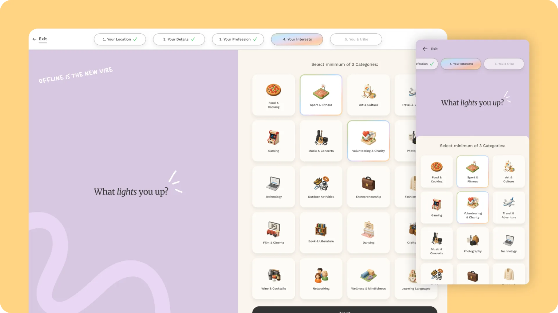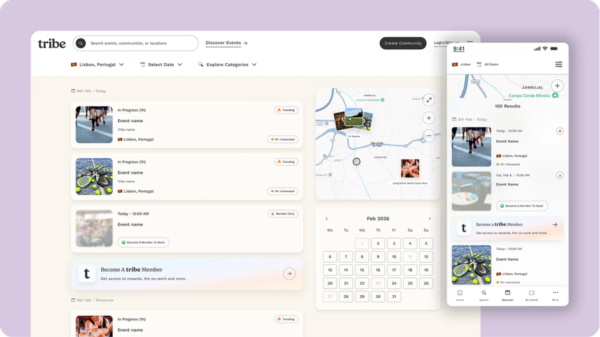 As Product Lead at Tribe, I held dual ownership of both product direction and design, leading a cross-functional team while personally delivering all UX and UI across the product.
